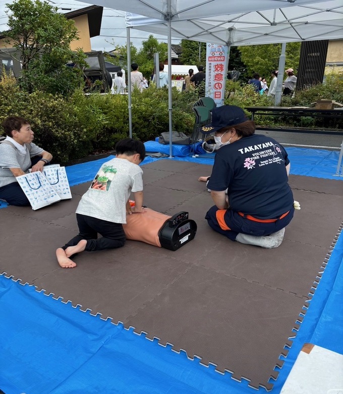 イベントでは、高山市応急手当普及員の女性消防団員による心肺蘇生法の体験ブース、救急隊員なりきり体験など様々なブースを用意し、救急隊が救急現場で実施する内容を実際に体験していただきました。