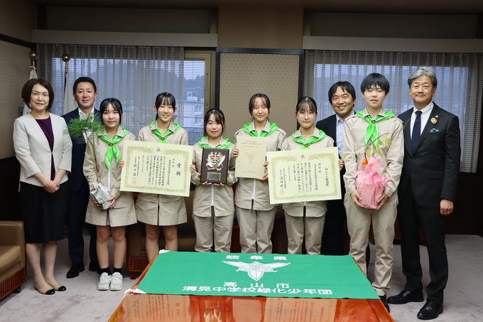 清見中学校緑化少年団の生徒6人が市長らを表敬訪問し、宮城県で開催された全国緑の少年団活動発表大会で「清見の豊かな森林を未来につないでいくために」と題して活動発表を行い、「みどりの奨励賞(国土緑化推進機構理事長賞)」を受賞したこと、また、第48回全国育樹祭式典で「全国育樹祭大会会長賞」を受賞したことを報告しました。