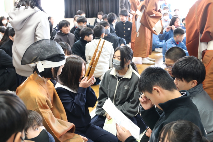 生徒たちは、「日枝神社の祭りで聴いたことがあり、心地よい感じがした。」「目の前で演奏を聴くと迫力があった。」「1300年もの歴史を受け継いでいることがすごい。」「実際に楽器を吹いてみるとなかなか音が出なくて難しい。」と歴史の重みと文化の深さを改めて実感することができました。