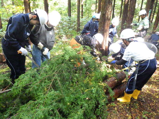 宮小学校の5年生16人が、飛騨高山森林組合の指導のもと間伐体験をしました。
