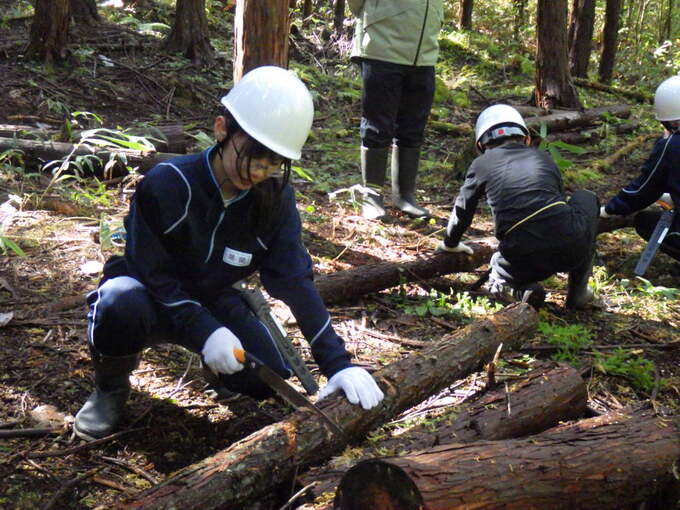 グループの代表の児童が、ノコギリで木が倒れる方向を決める受け口、倒れるタイミングを決める追い口を作り、残りの生徒で安全に木を倒すために木の上部に取り付けたロープをひいて伐倒しました。伐倒後、森が明るく光がはいるようになった、などの感想があり、間伐の効果を実感していました。そのあと、ノコギリで枝払い、玉切りと呼ばれる50センチの長さに丸太を切る作業も体験しました。枝払いした枝は、アロマオイルを作るのに利用されます。